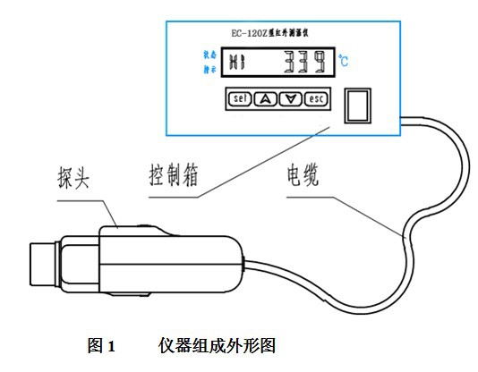 紅外測溫儀是一個非接觸溫度測量系統(tǒng),通過測量物體所輻射的紅外能量來進(jìn)行溫度測量。該儀器組成如附圖1所示,由探測頭和控制箱通過信號電纜連接組成。探測頭將被測目標(biāo)所輻射的紅外能量通過光學(xué)系統(tǒng)會聚到紅外傳感器上,并將其轉(zhuǎn)換為電信號,該信號經(jīng)放大處理后通過電纜傳送到控制箱,控制箱顯示相應(yīng)的溫度值。