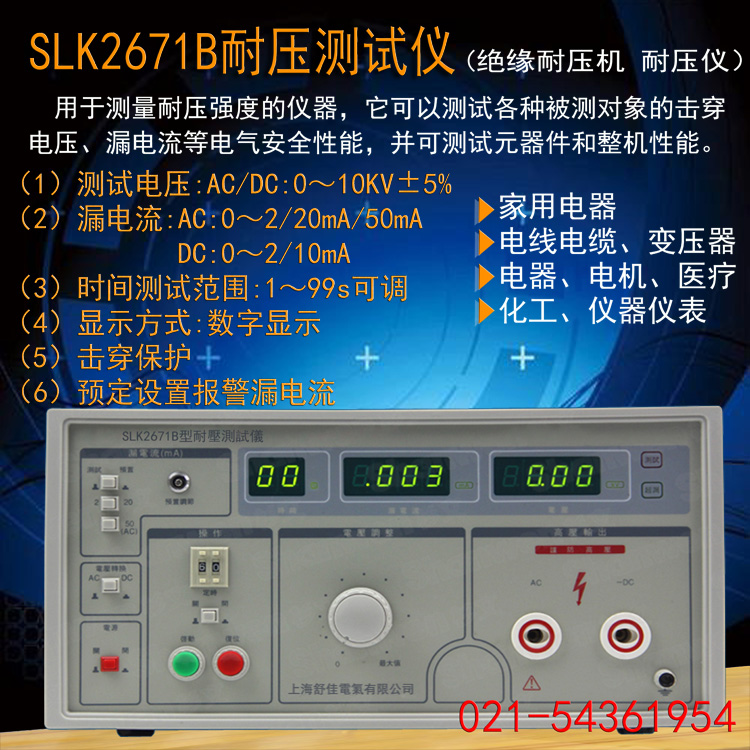 耐壓測(cè)試儀是測(cè)量耐壓強(qiáng)度的儀器,它可以直觀、準(zhǔn)確、快速、可靠地測(cè)試各種被測(cè)對(duì)象的擊穿電壓、漏電流等電氣安全性能指針,并可以作為高壓源用來測(cè)試元器件和整機(jī)性能。SLK系列耐壓測(cè)試儀產(chǎn)品系列,是按照IEC、CSA、UL、JIS等國(guó)際國(guó)內(nèi)的安全標(biāo)準(zhǔn)要求設(shè)計(jì)的,耐壓輸出1kV-50kV,漏電流0-200mA。適合各種家用電器、電源開關(guān)、電線電纜、變壓器、接線端子、高壓膠木電器、電機(jī)、醫(yī)療、化工、儀器儀表等,以及強(qiáng)電系統(tǒng)的安全耐壓和漏電流的測(cè)試、同時(shí)也是科研實(shí)驗(yàn)室、技術(shù)監(jiān)督部門不可缺少的耐壓試驗(yàn)設(shè)備。